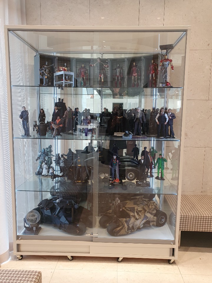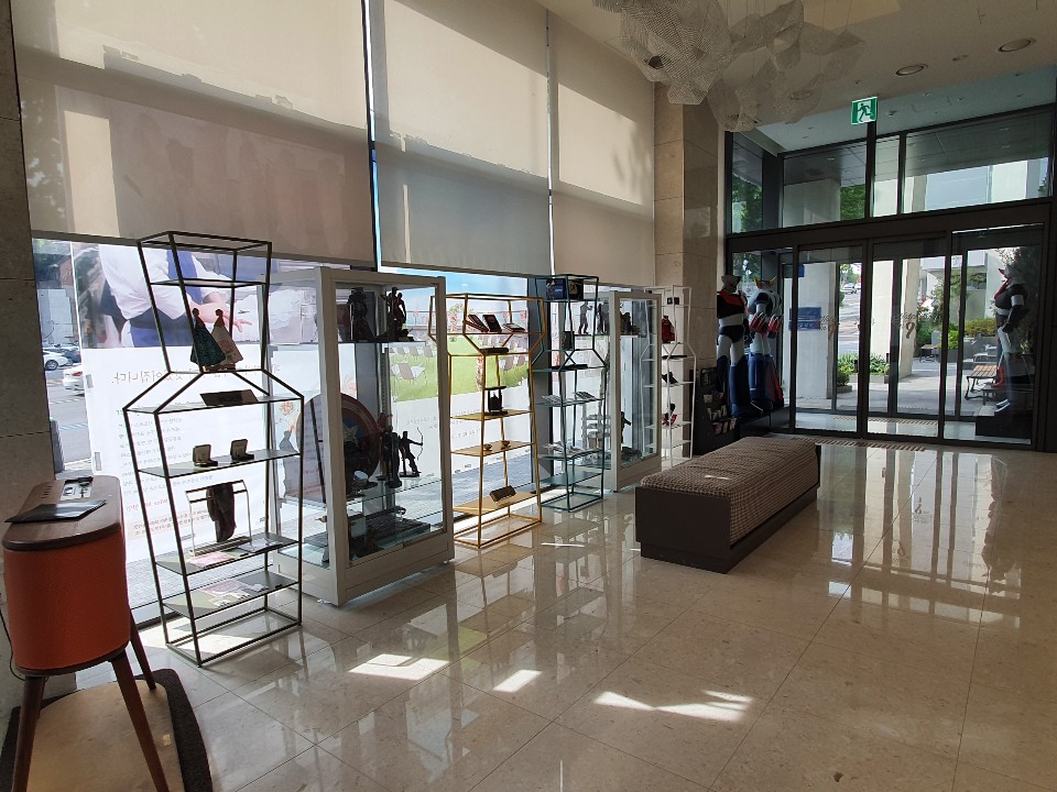 로비는 화이트톤의 정갈한 분위기를 풍기고 있었고 여러 피규어가 한쪽 벽면을 가득 채우고 있다는 점이 굉장히 특이합니다.