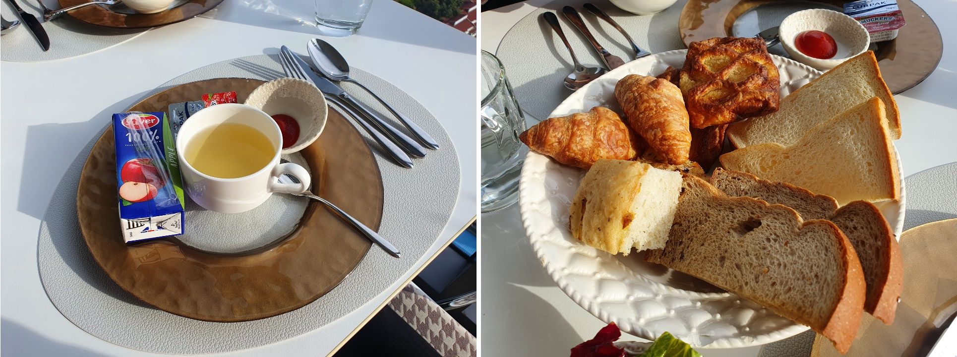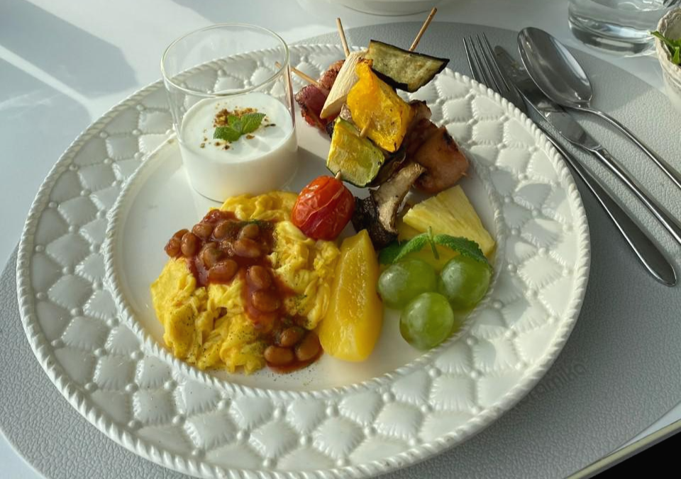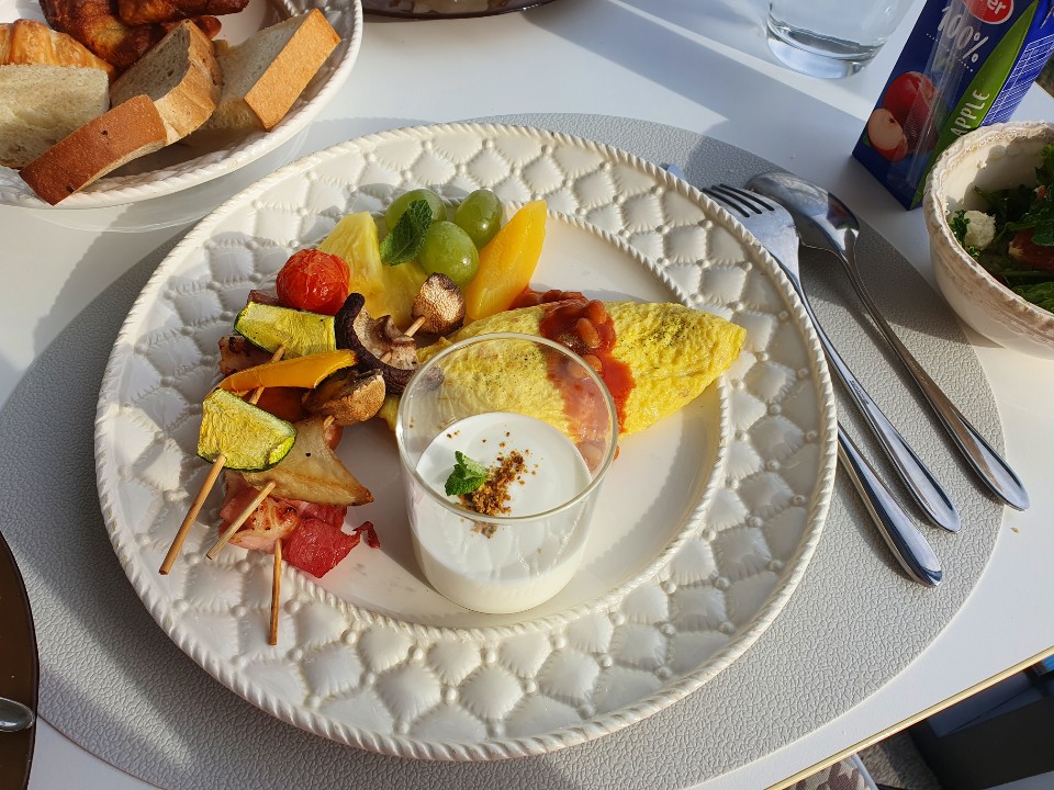 조식은 코스로 제공되었으며 메인 계란 요리를 스크램블과 오믈렛 중 선택할 수 있었습니다.