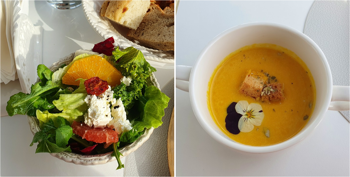 음식이 나온 순서는 녹차&사과주스 → 샐러드 → 빵 → 단호박 스프 → 메인 메뉴 순서입니다.