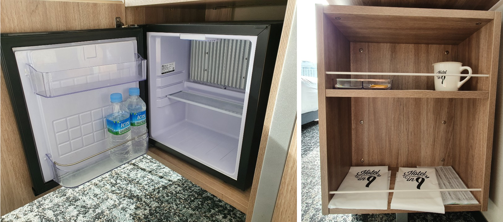 데스크 아래에 냉장고가 들어있고, 생수 2병이 무료로 제공되었습니다.