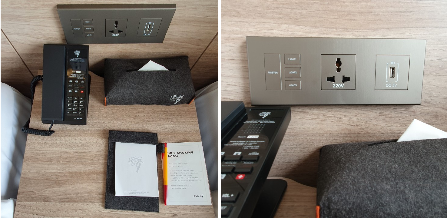 전화기, 티슈, 메모지와 볼펜이 있었고 콘센트가 USB를 바로 꽂을 수 있도록 만들어져 있었습니다.